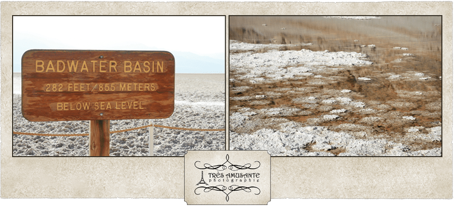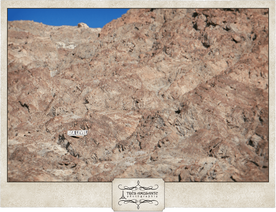 When we started out on the long walk along the salt flat, we had no idea how hot and miserable this walk would be. The 110 degree air temperature hadn’t really affected us much all day, but that changed with this walk. The sunlight reflected off all of the salt and the heat just hung in the thick air. When we turned back, we had an interesting perspective. See that tiny white speck in the center of the photo? That’s the sea level sign above the parking lot. It blew our minds.