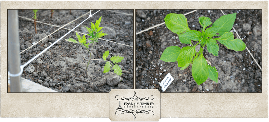 The tiny tomato plant reaches for the trellis and the green pepper is off to a good start.