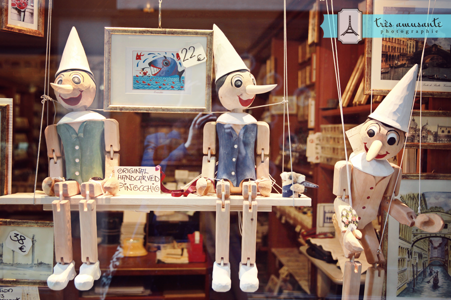 I thought these Pinocchios were adorable, so I stopped for a shot and I spotted a tiny critter among them who seemed a little out of place. Justin’s been to Australia twice, and we happen to have those very koalas perched all over the house, so I was tickled pink to see one sitting in a Venetian window display.